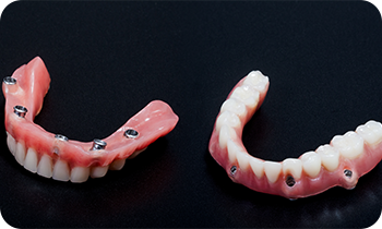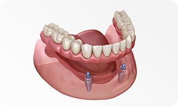 顎の骨に埋め込んだインプラントを支えにして入れ歯を固定する方法です。通常の入れ歯よりも動きにくく、しっかり噛めるのが特長です。外して清掃できるため衛生的で、総入れ歯の安定性に悩むかたに適した治療法です。